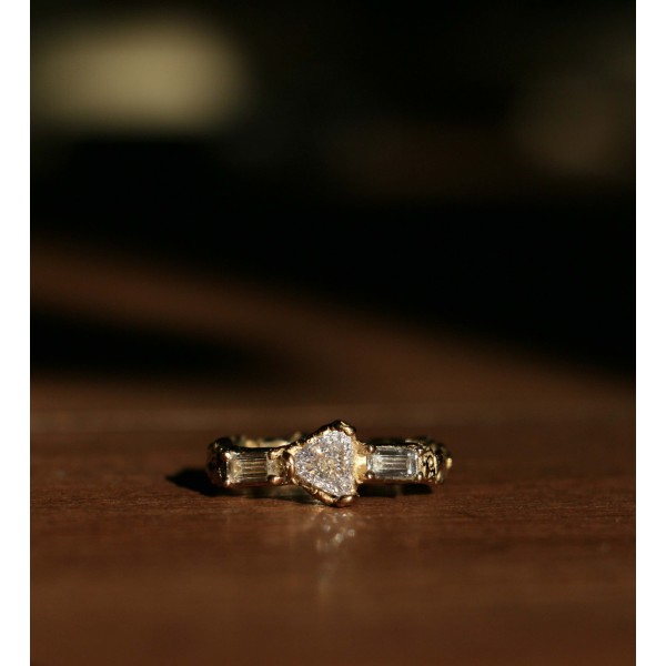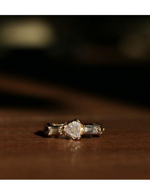 Les diamants géométriques se répondent dans leur éclat telles les figures d’une voile de cerf-volant tendue par le vent, alors que le corps de bague sculpté se déroule comme un fil… Une traine légère et joyeuse aux reliefs exotiques qui fait voyager notre imaginaire. Cette bague est en or jaune 18 carats. Elle est sertie d’un diamant à la taille triangle remarquable et de deux diamants baguette un total de 0.93ct carats. Son poids est de 5 g environ.