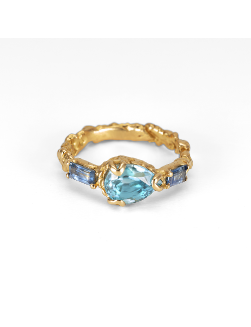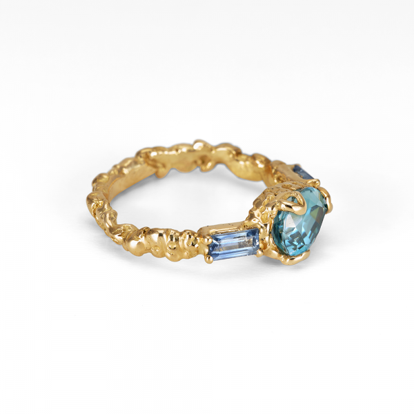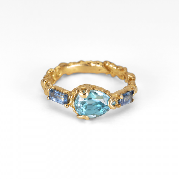 A striking azure blue geometry, like a radiant kite sail standing out against the sky. The turquoise sparkle of the center stone is enhanced by a series of open settings and heightened by the intensity of the two sapphires connecting it on either side. This ring is made of 18-karat yellow gold. It is set with a 4.6 carat turquoise zircon from Cambodia (a fascinating natural stone, older than diamond and also very hard, among the oldest known gems) and two baguette-cut blue sapphires. It weighs approximately 4.4 g.